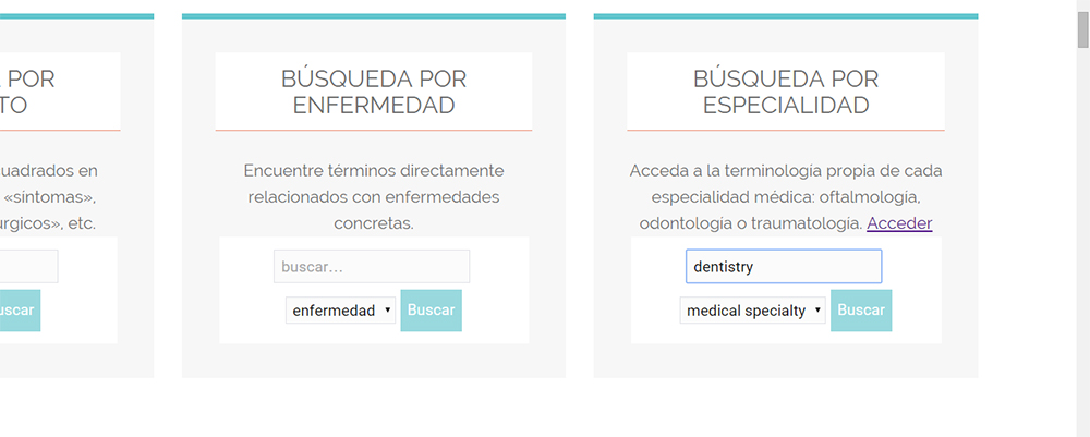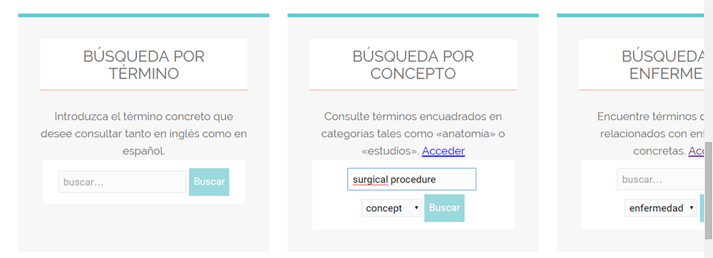 - En el caso de que desee buscar un término perteneciente a un concepto concreto (procedimientos quirúrgicos, materiales, prótesis, etc.), puede seguir las siguientes instrucciones: